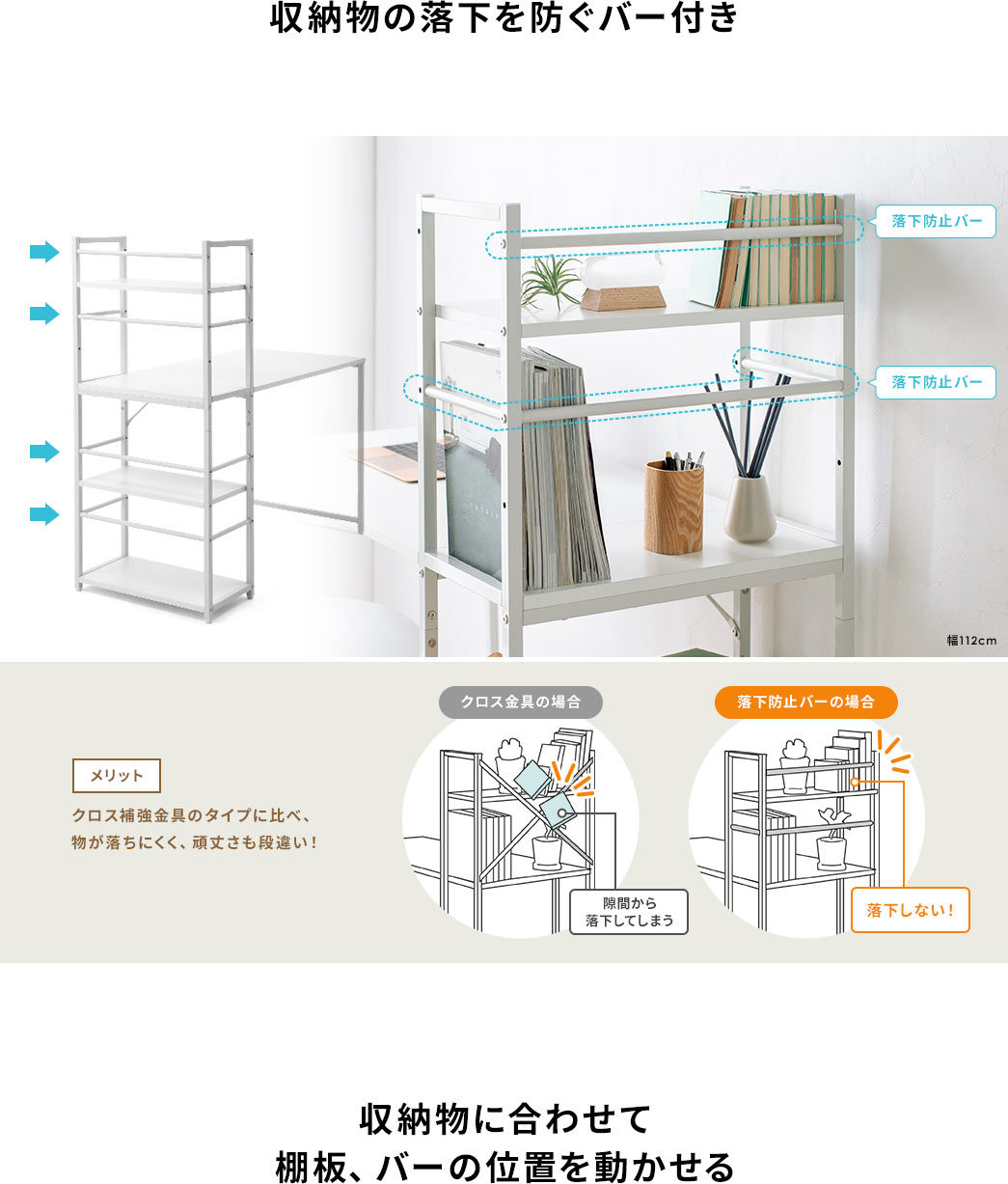収納物の落下を防ぐバー付き メリット クロス補強金具のタイプに比べ、物が落ちにくく、頑丈さも段違い! 収納物に合わせて棚板、バーの位置を動かせる