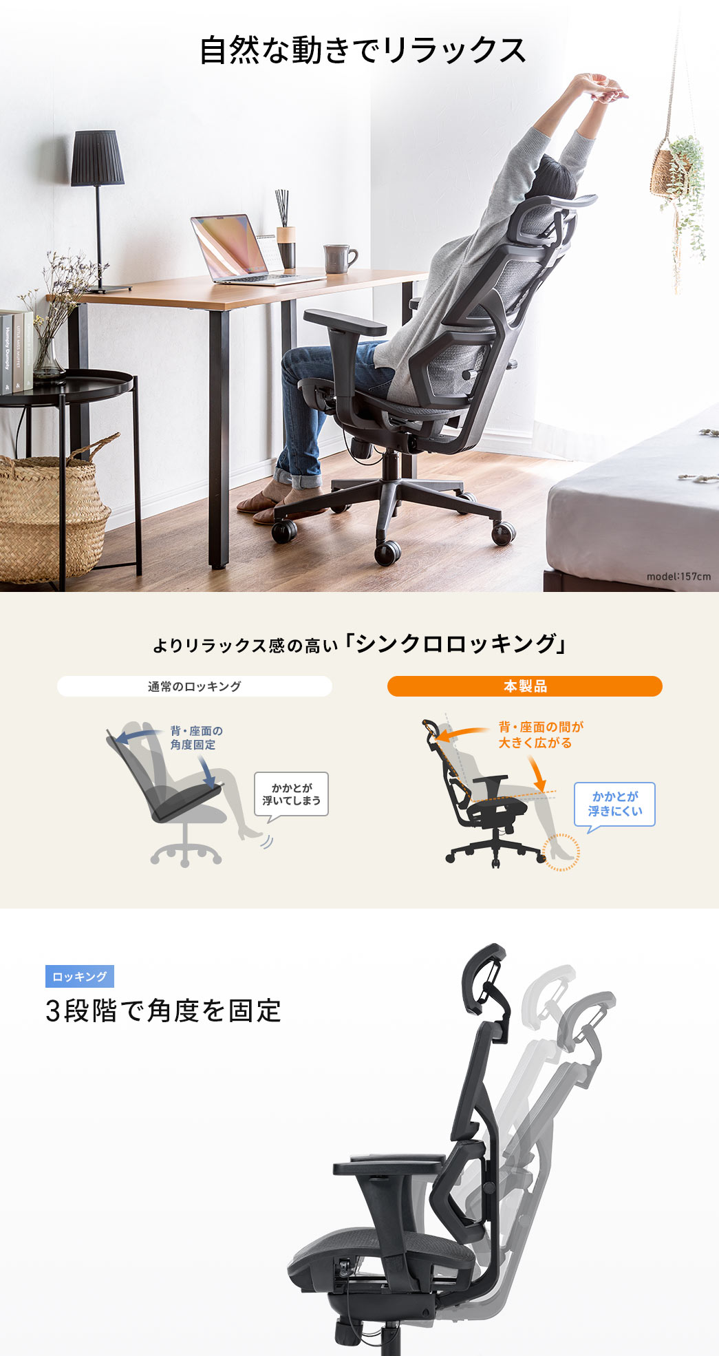 座面と背もたれ間が大きく開く「シンクロロッキング」を採用。